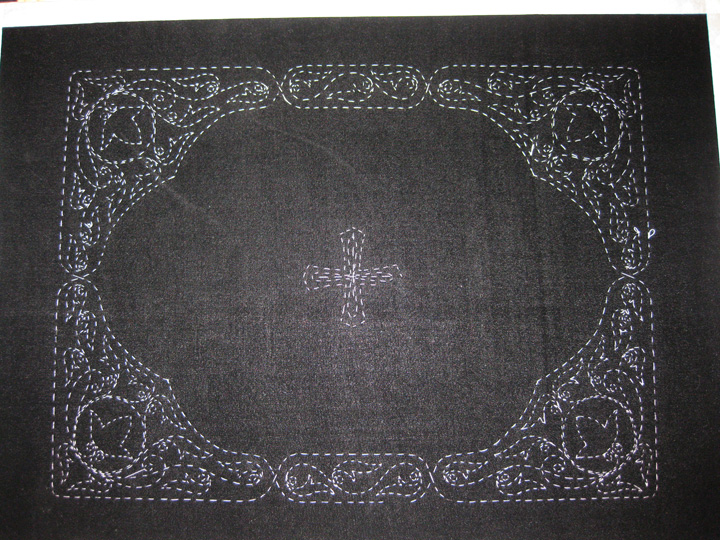 Лена, мы шили и белой и черной. На мой взгляд черной лучше, но мы ведь шили по бархату и собственно все нитки прятались сами в ворсе. Только с изнанки и видно какими где прошито